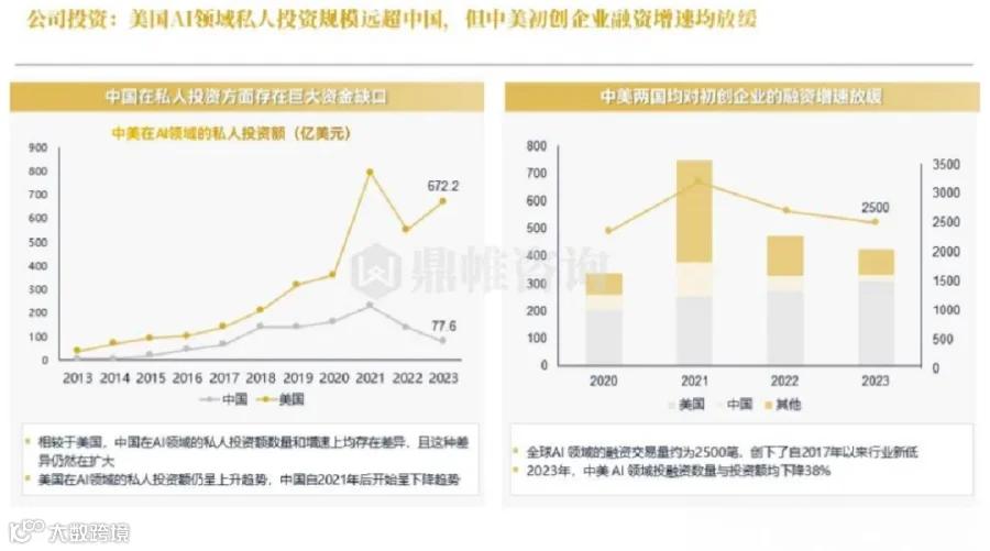 报告指出,美国 AI 领域私人投资规模远超中国。同时,中美两国均对初创企业融资增速放缓。