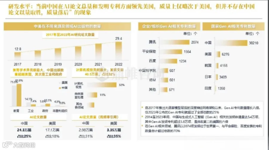 报告指出,当前中国在 AI 论文总量与发明专利方面领先于美国,但质量略次于美国。