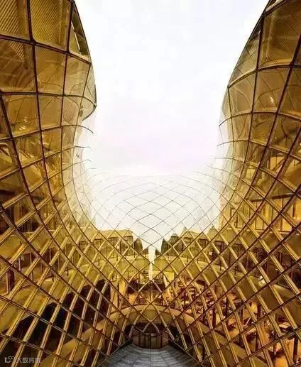 “琥珀入口”弯曲的钢化玻璃延伸于网格壳结构中,其曲线和迂回让日光穿透至入口庭院,站于此处仿佛走进了科幻大片中穿越时空的隧道之口。