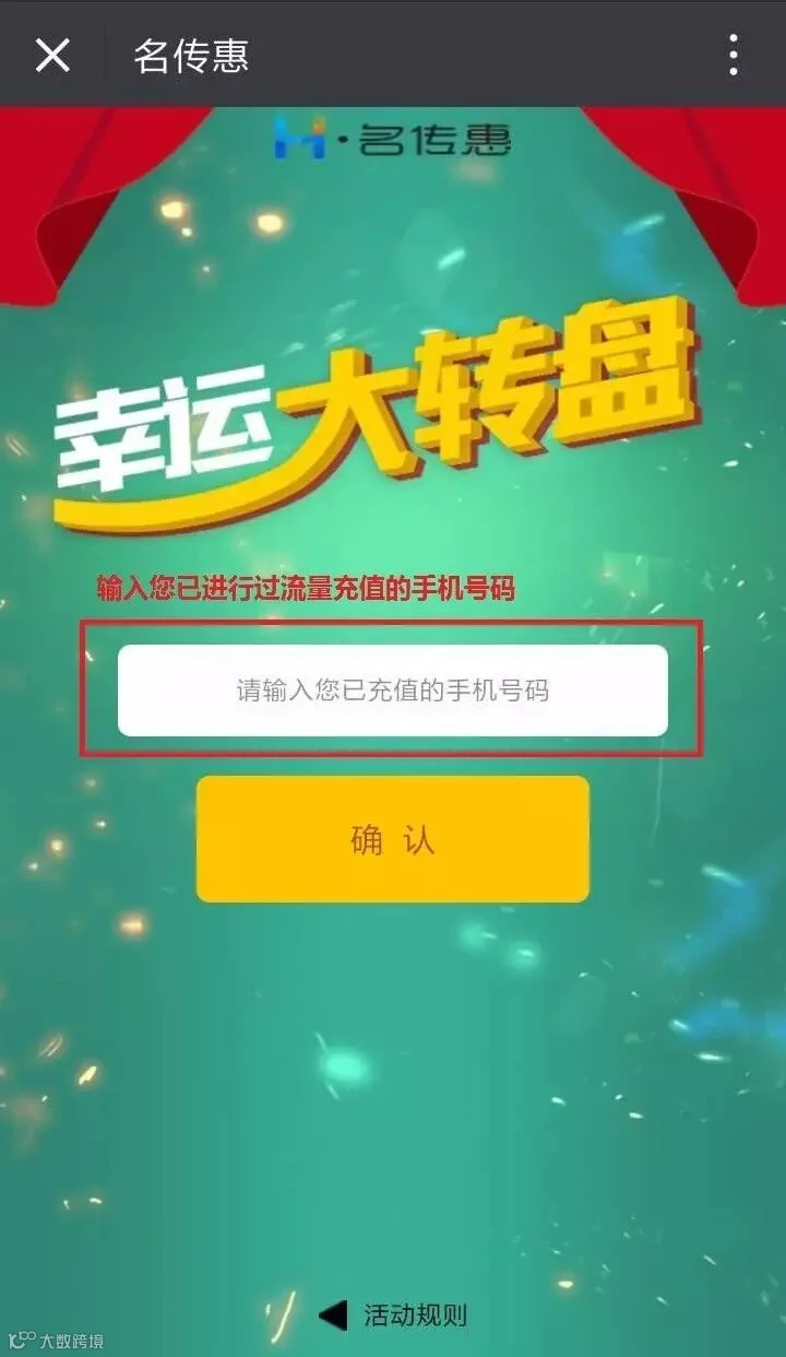在幸运大转盘活动页输入框输入您已进行流量充值的手机号,然后点击确认;