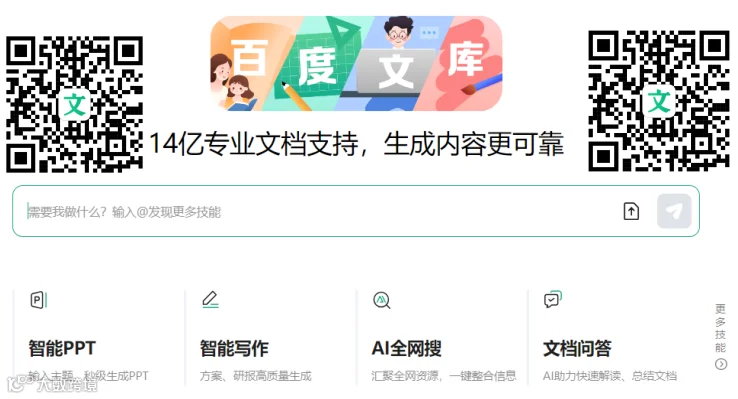 教师、科研人员、学生、政企文员、公司管理人员、新媒体运营等与时俱进、追求高效的朋友们:长按(扫码)识别以下二维码,体验庞大知识库背后的一站式AI内容获取和创作平台——文库AI文档助手!开启你的智能工作、智能生活、智能学习之路,提高你的工作效率和学习效果,提升生活品质。