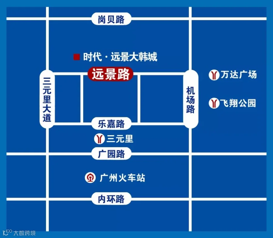 地铁:地铁2号线到飞翔公园站C出口下,步行800米可至时代•远景大韩城;地铁2号线三元里站C2出口乘坐475路公交车到远景路站下车即可。