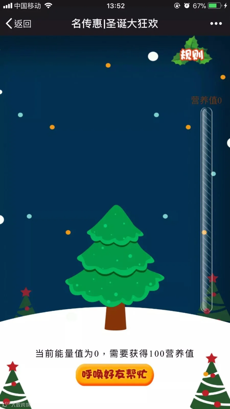 2.参与游戏邀请好友装饰圣诞树,每位好友成功装饰后,您的圣诞树即可获得相应的能量值,当能量值满100后,您即可获得抽取圣诞礼物资格。