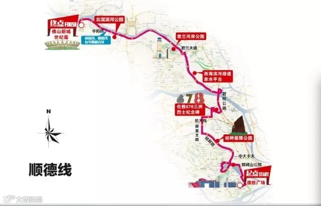 德胜广场(起点)—顺峰山公园—桂畔极限公园—伦教678三洲抗日烈士纪念碑—西海亲水平台—君兰河岸公园—北滘河滨公园—世纪莲体育中心(终点)