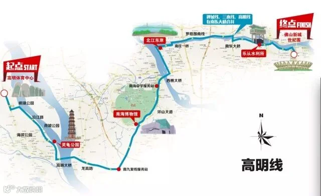高明体育中心(起点)—灵龟公园—南海博物馆—北江东岸—乐从水利所—世纪莲体育中心(终点)