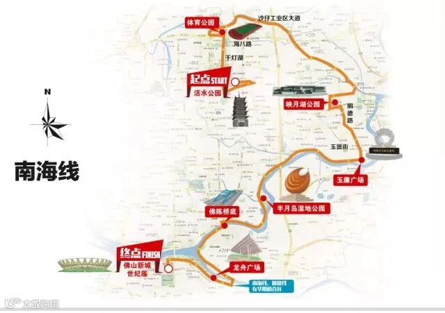 千灯湖活水公园(起点)—南海体育公园—映月湖公园—东平社区公园—半月岛湿地公园—佛陈桥底—华阳桥—世纪莲体育中心(终点)