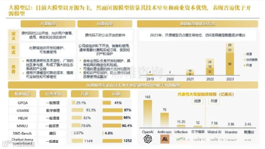 目前大模型以开源为主,然而闭源模型依靠其技术壁垒和商业资本优势,表现普遍优于开源模型。