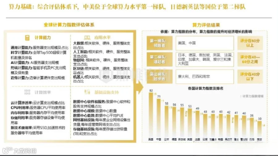 整体来看,中美位于全球算力水平第一梯队,而日德新英法等国位于第二梯队
