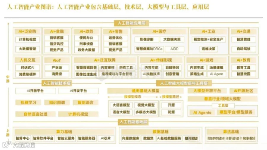 我们可以看到,人工智能的产业图谱包含三层。最上层为应用层,中间层为人工智能技术层和人工智能大模型层,最底层则为人工智能基础层,包含算力基础、数据基础以及算法基础。