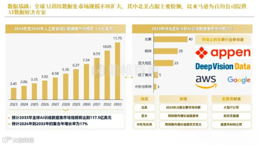 与数据中心一样,全球的 AI 训练数据集的市场规模在持续扩大中,其中北美占据主要份额,以亚马逊为首的公司提供 AI 数据解决方案。