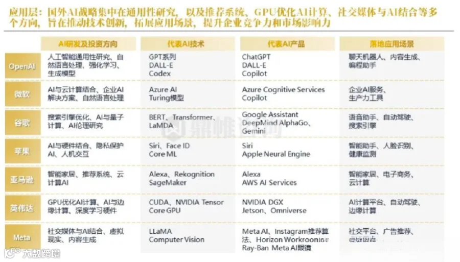 而国外的 AI 战略则集中在通用性研究,以及推荐系统、GPU优化 AI 计算、社交媒体与 AI 结合等多个方向,旨在推动技术创新,拓展应用场景,提升企业竞争力和市场影响力。