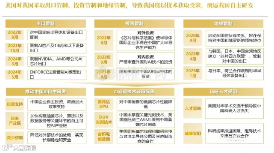 美国加强了面向中国市场的 AI 芯片禁令,特别是对性能和密度超过特定标准的芯片实施出口管制。这对依赖高端 AI 芯片的中国企业造成了一定影响,不过反而也加速了中国自主研发 AI 芯片的步伐。