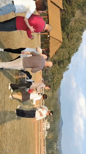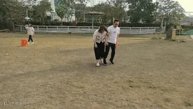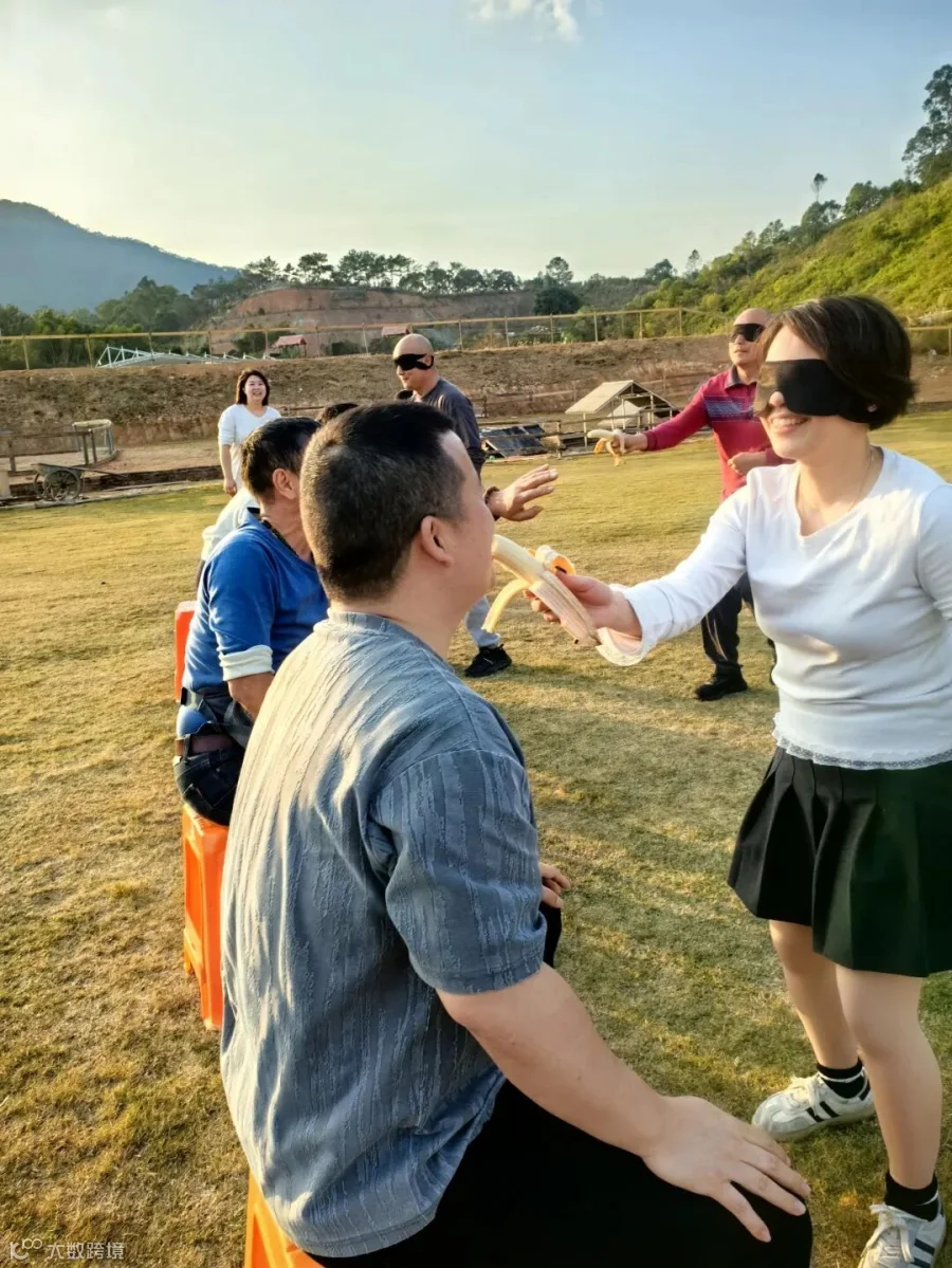 第二轮游戏,是转圈走直线喂香蕉,上次玩游戏有人迷失方向,南辕北辙撞树引发爆笑,这次大家都有了防备.但没想到比赛规则升级,蒙眼选手不仅要转圈,还被调换出发位置,前路十分坎坷,只能靠着被喂队友的喊话,艰难摸索,还好,这次大家没有跑太远.两组各拿一局打成平手.