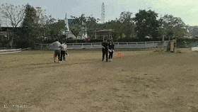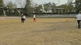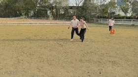 年会下午四点开始,大家先去草坪上玩游戏,按男女人数分成两组,每组4队9人,先玩考验团队合作力的两人三足游戏,两两绑腿的大家,努力控制步伐节奏,绕障碍物后返回,以最后一队返回早晚判定胜负.