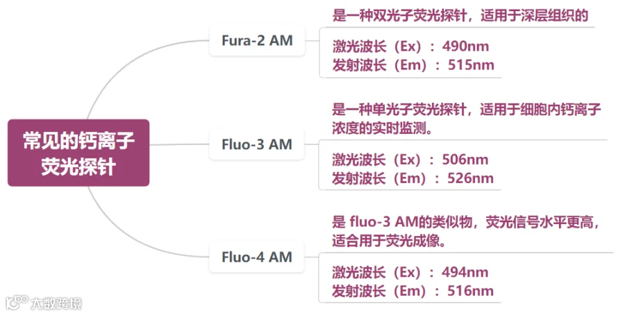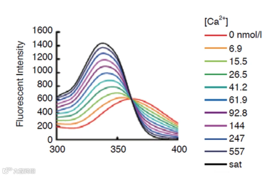 不同之处则在于,Fura-2是紫外光激发的比值型或双波长荧光染料,其激发特性与Ca2+浓度有关,当介质中没有Ca2+时,其激发峰为380nm,当与钙结合时,激发峰向短波方向340nm处移动,最后分别以340nm、380nm激发得到发射光的比例,这种比例与细胞内Ca2+浓度成正比例的关系。比值型荧光探针减少了染料负载导致的指示不均匀、不良的染料保留和光漂白的影响。另外Fura-2还具有较强的抗荧光淬灭能力,在荧光显微镜或其它荧光检测设备上可以连续检测较长时间,也不会明显影响其荧光效果。