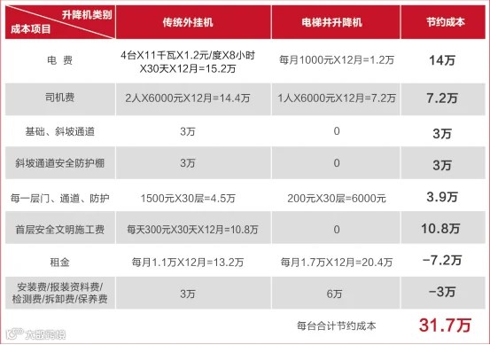 一般来说,传统外挂式施工升降机为了实现材料和人员的升降运输,耽误了全钢爬架、铝合金模板、主体外墙施工、地面车库施工、小区路面硬化、绿化等一系列工序,在承担渗水等质量问题的同时,还要花费额外的时间和成本去修补预留孔洞,不但增加了风险,更有后续使用过程中渗水等各种风险。