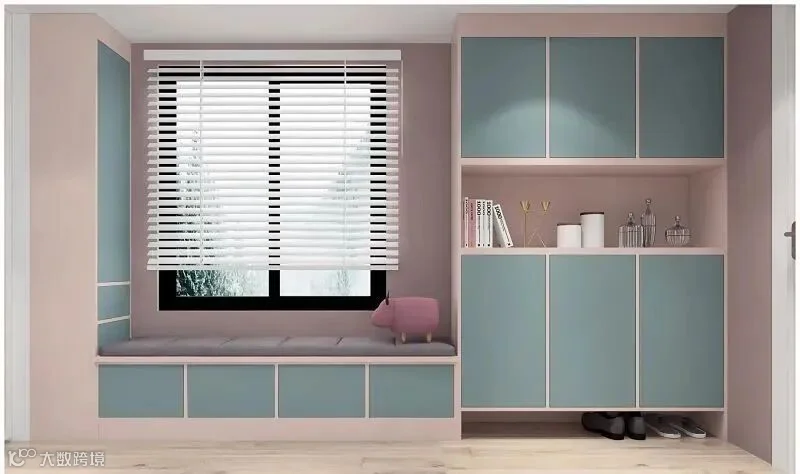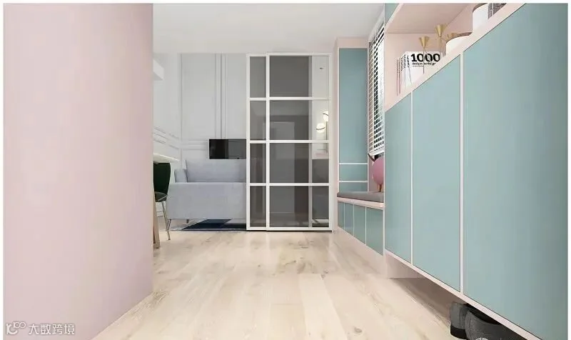 14.长走廊玄关,靠墙做玄关柜+卡座,收纳空间多。暗粉色+清水蓝的配色,清新可爱。