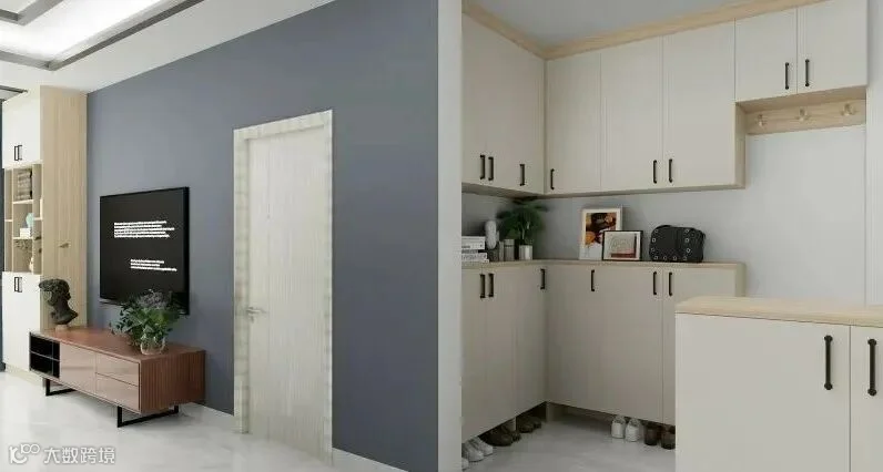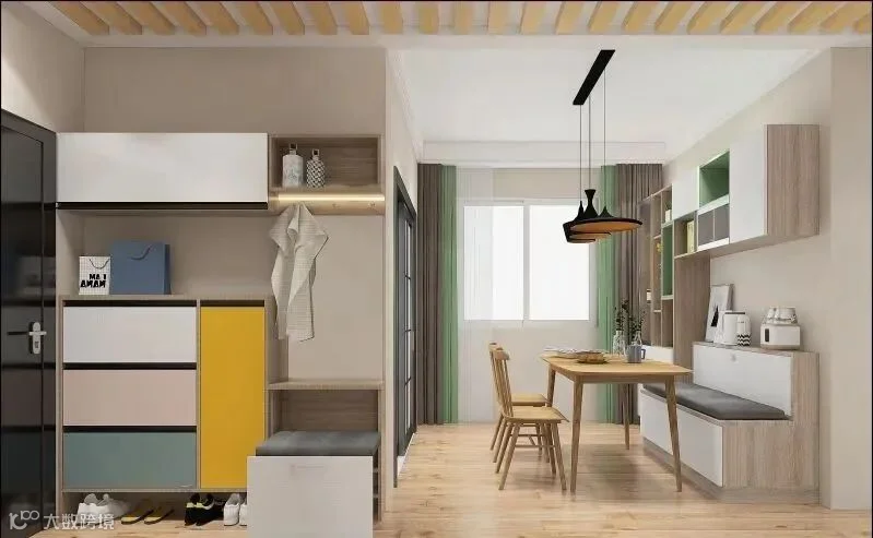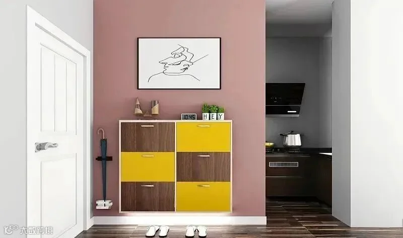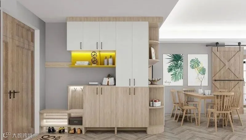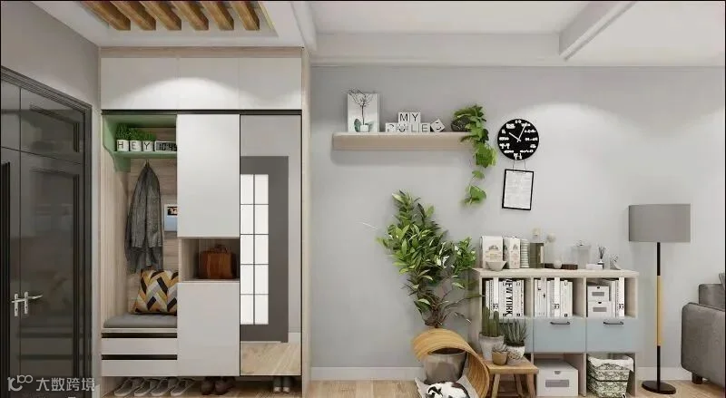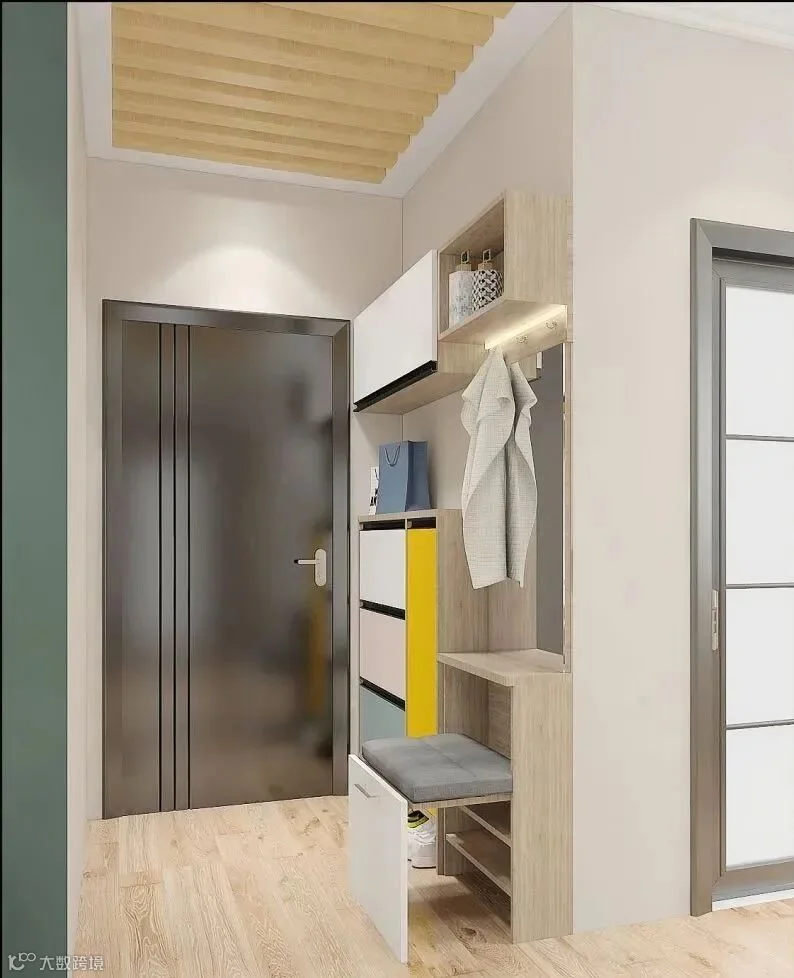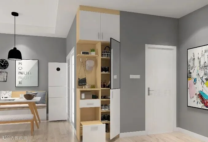 12.入户有一个相对独立的小空间,做转角玄关柜最合适,把两面墙都利用起来,再做个矮柜作为隔断柜。