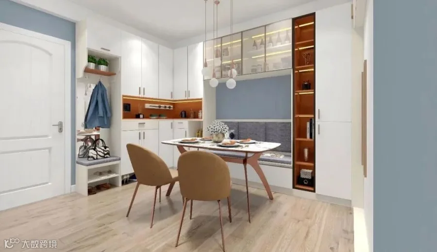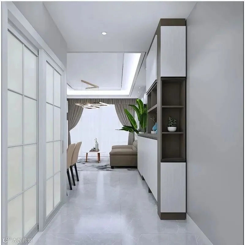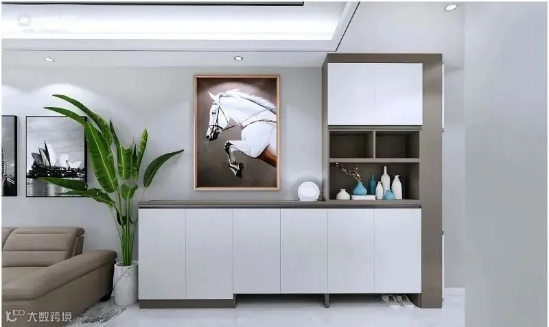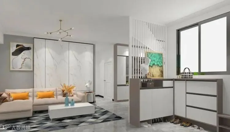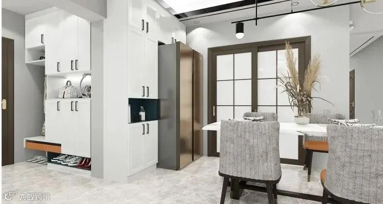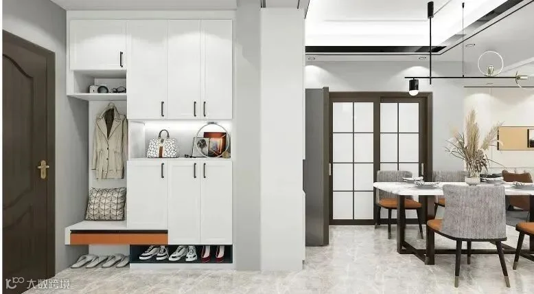 15.L型玄关柜,矮柜一直延伸到餐厅,可以充当餐边柜,一举两得,灰白配色也彰显高级感。