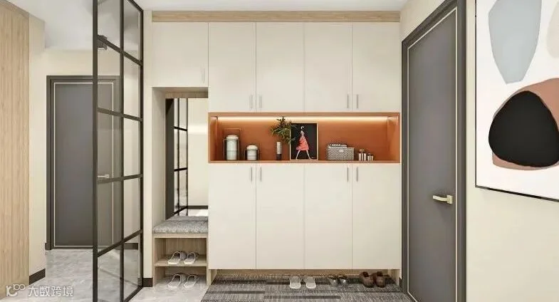 06.用黑框玻璃做隔断,靠墙做整墙玄关柜,收纳空间多,功能齐全。中间的开放格还装了自动感应灯带,拿取物品更方便。