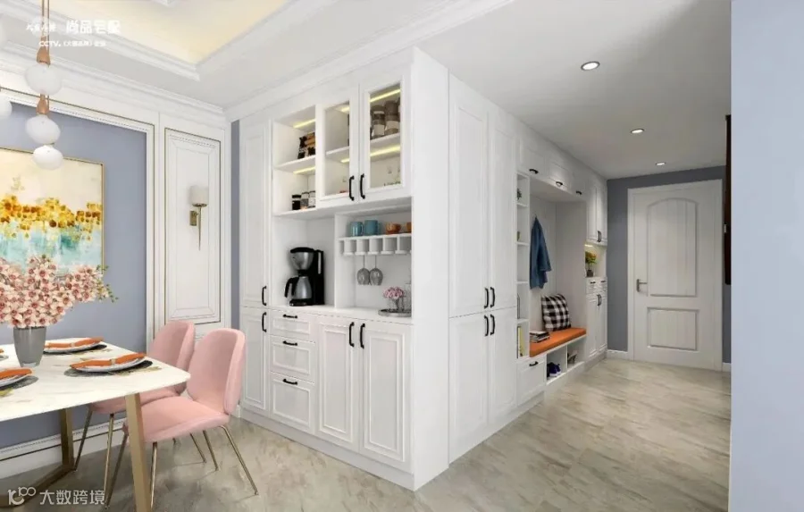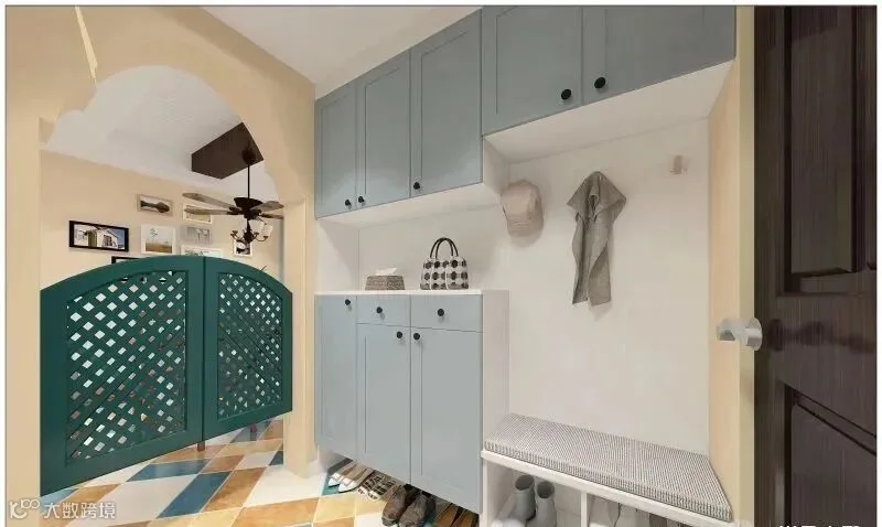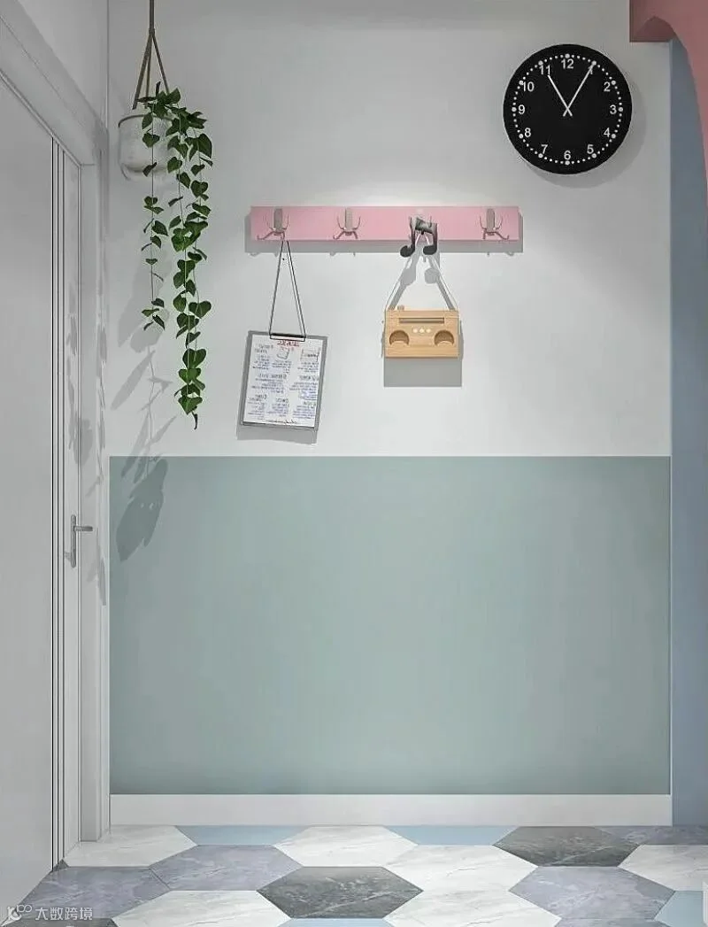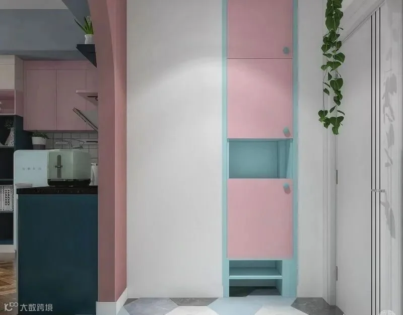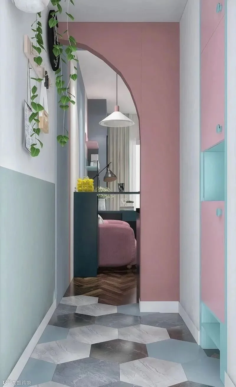 16.入户小门厅,小圆拱门设计,更有仪式感~靠墙内嵌一列顶天立地的玄关柜,另一侧是挂衣区,平时可以挂衣服、包包等。粉白绿蓝的配色+六角菱形地砖,增添了有些许梦幻