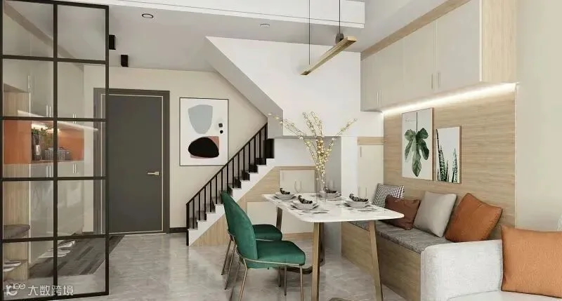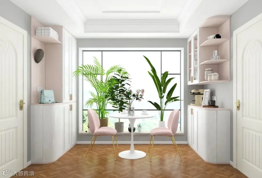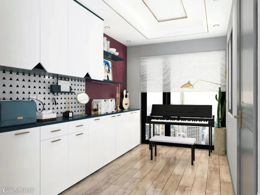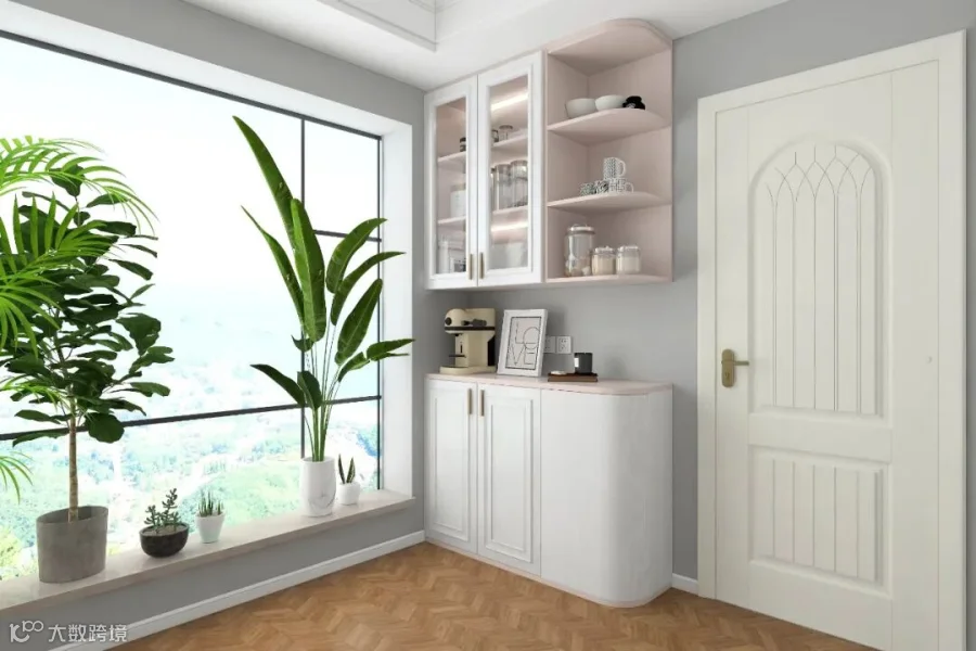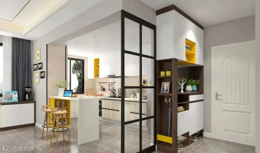 07.先用造型栅栏做隔断,沿着栅栏和墙设计L型转角组合柜,非常实用~