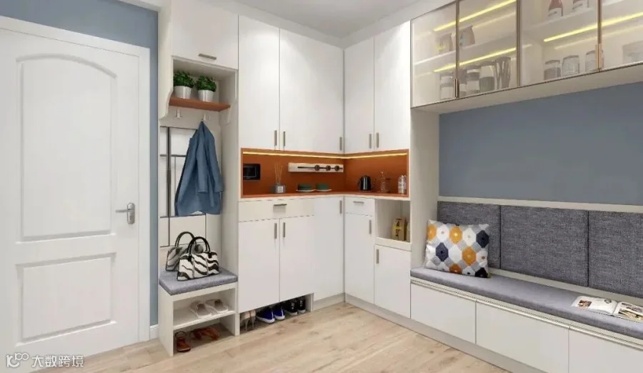 10.针对入户的转角空间,一体设计是最佳的方案,这种设计的空间利用率非常高,且一体化造型十分耐看。