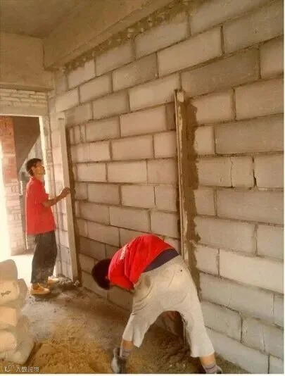 确定砌墙位置后,师傅会把新老墙交接处的老墙体一边批荡层打掉,宽度不少于200mm。如新老墙交接呈T字形墙时,老墙批荡除新砌墙体厚度外,两边分别打掉200mm批荡层,以便于挂网连接。