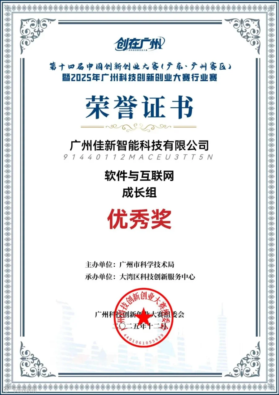 本次获奖,标志着佳新智能在技术实力、商业模式及未来发展潜力方面获得了政府与市场的双重认可,更是企业深耕赛道、持续创新的有力见证。未来,佳新智能将以此次获奖为新的起点,继续秉持创新发展理念,加大技术研发投入,不断提升核心竞争力,为广州科技创新事业注入更多新活力,持续以AI+金融科技赋能实体经济高质量发展!