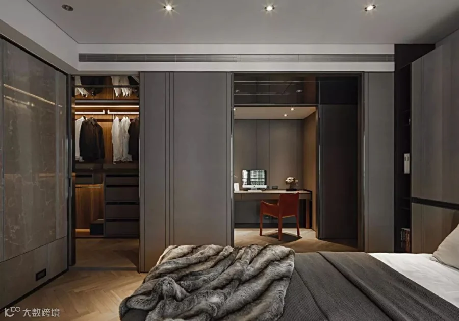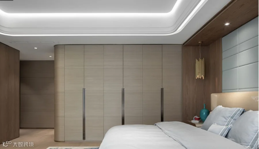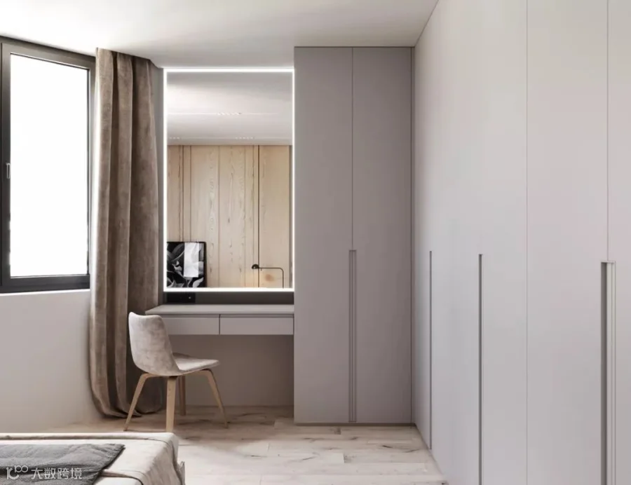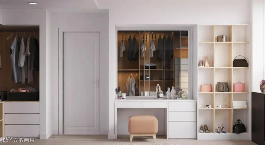 相对于传统衣柜来说,这种与墙面融为一体的衣柜形式,整体感更强,更有利于清洁,比较适合衣物较多,需要较大存放空间的家庭。