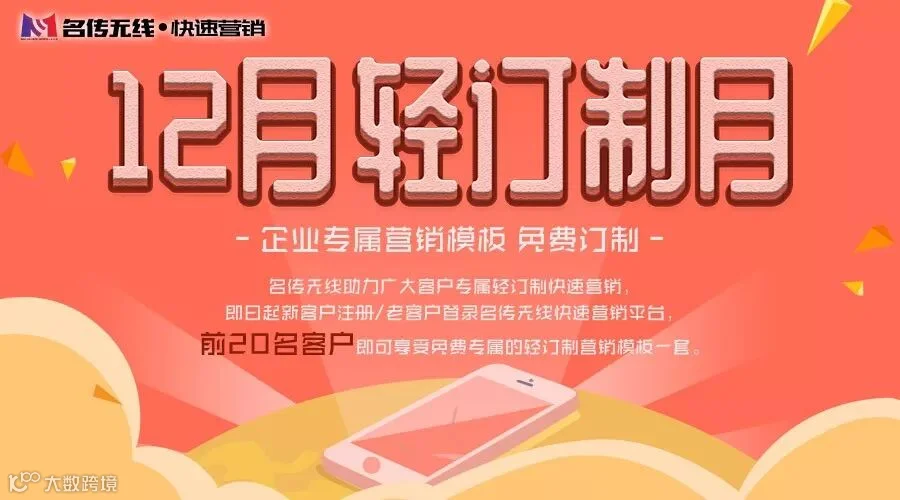 除了免费活动模板+流量助力,这个12月,名传无线轻定制月活动持续开启中!20套专属轻定制营销活动H5名额,限时开抢,先到先得,戳下图即可直达!