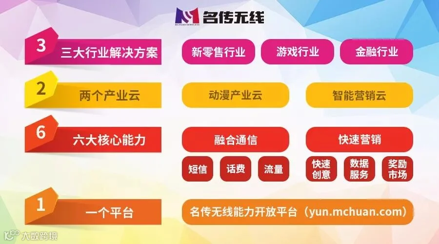 自创建以来,名传无线始终坚持“DATA IS POWER”的理念,充分发挥“无线+4A”的独特优势,致力于整合融合通讯和快速营销的产品能力及大数据能力为企业提供先进而高效的通讯及营销解决方案。