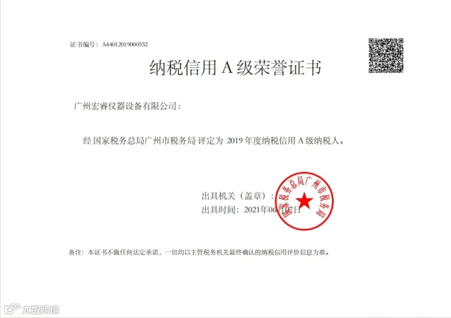2024年6月,广州宏睿仪器设备有限公司(下称“广州宏睿”)荣获“2023年纳税信用A级纳税人”称号,2019年至2023年已连续5年获奖。