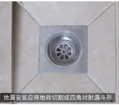 地漏,这是一级排水。在墙面找平、地砖铺设时应注意放2-3%坡度向地漏。地漏口的铺贴应切成四角呈放射状,回字形水槽,安装应略低于整体平面,使其排水迅速、不积水。