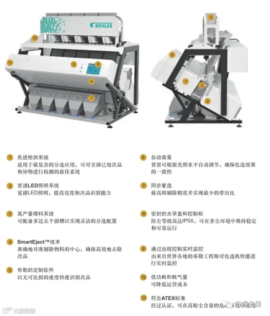 食品加工工艺过程的食品安全在线防护,从原料筛选开始!!BUHLER(布勒)索特克斯A系列色选机提供突破性的技术优势,光学分选的巅峰之作,为原料端的质量控制和异物控制带来非常可靠的安全保障。