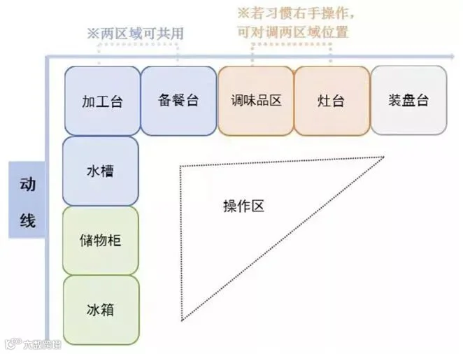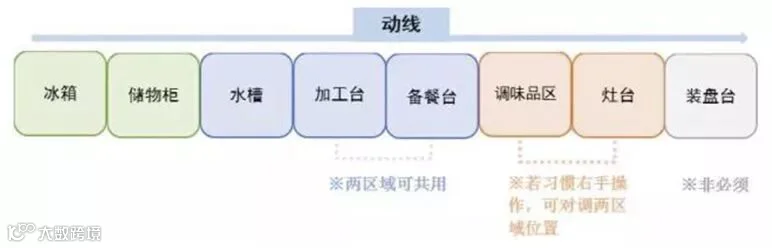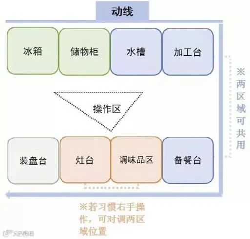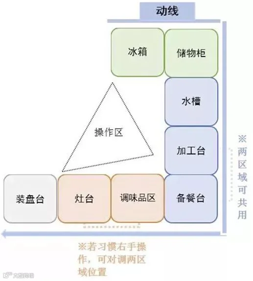 空间需求小,储藏区→备餐区→烹制区一条动线贯穿整个流程。