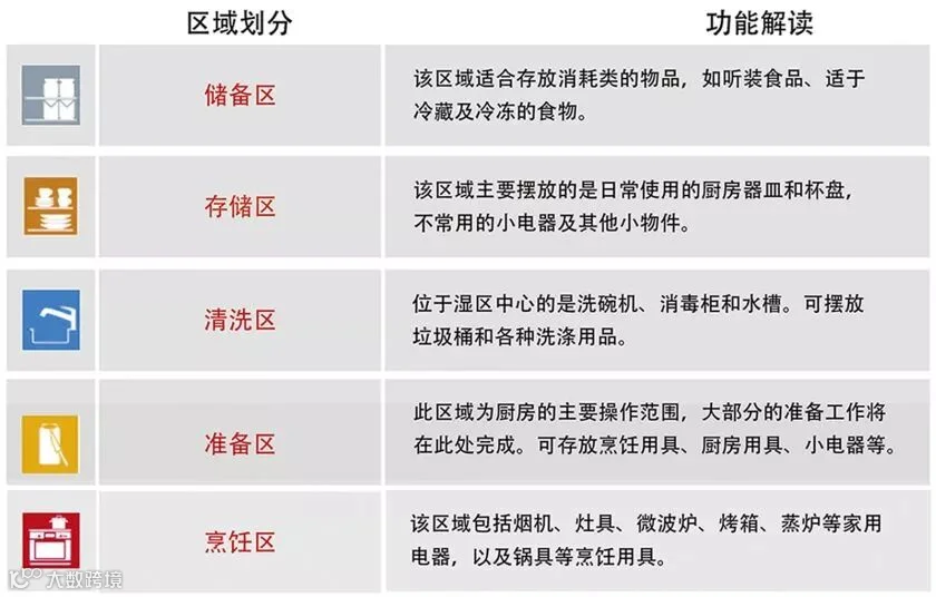 根据房屋朝向和结构选择布局类型,可以把厨房分成三个主要工作区——烹饪区、储存区和清洗区,合理安排三个区域,使其符合人体工程的工作三角。