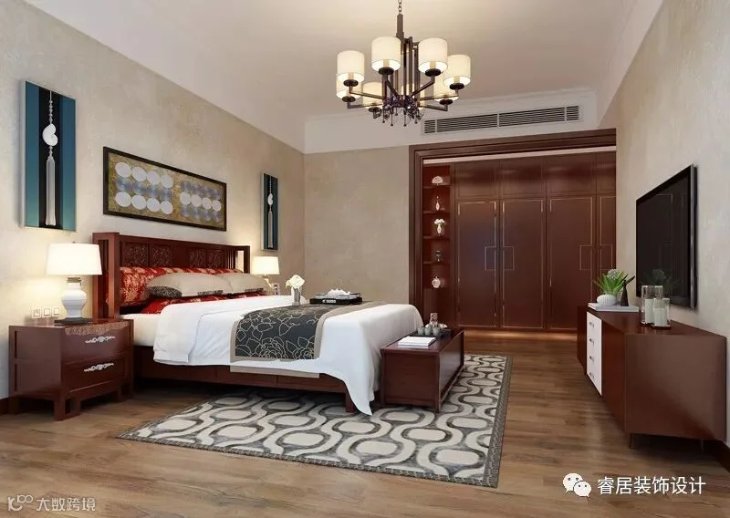 ▲主人房用红木色的家居却呈现出古典的韵味,床头悬挂的装饰品避免背景墙的单调,美化了室内环境。