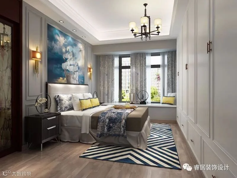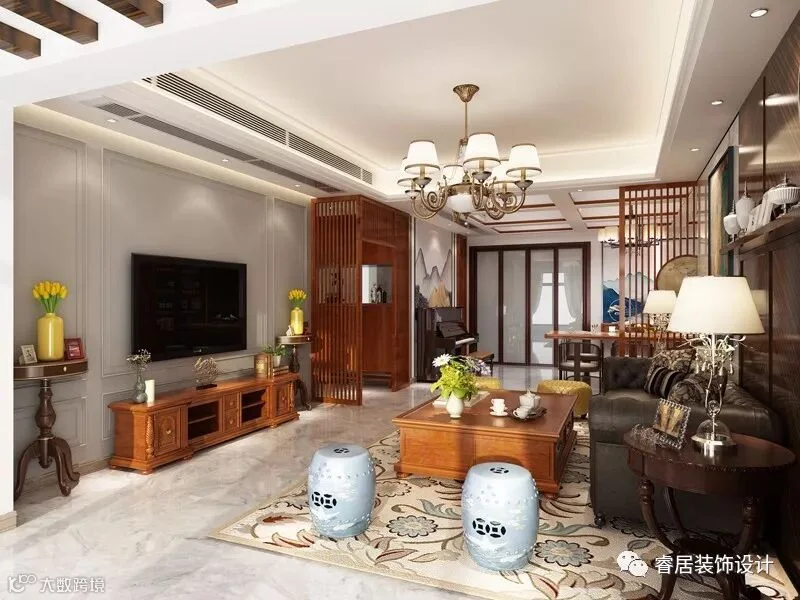 业主想要中式风格而又不想“老气横秋”,家人又喜欢美式的风格,所以给出的设计方案是在公共区域采用中式风格,在卧室采用美式元素。