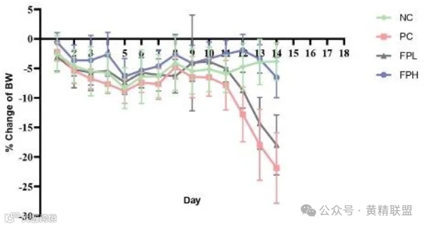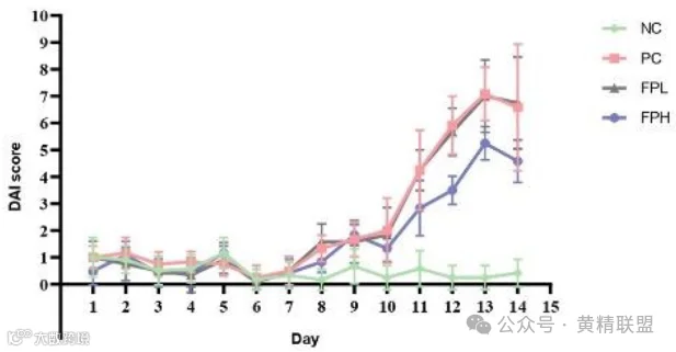 研究评估了小鼠的每日体重变化、DAI评分和结肠长度变化,以确定FP对结肠炎小鼠体重、活力和疾病进展的影响。图2所示,与NC组相比,PC组和FPL组分别在饮用含DSS水2天和4天后体重显著下降。FPH组仅在终点前1天观察到体重急剧下降。实验结束时,FPL组和FPH组的平均体重分别比PC组高3.18%和20.38%。补充FP可有效抑制DSS诱导的结肠炎的DAI评分,其中FPH组的效果更为显著(图3)。从图5.A~B可以看出,PC组的结肠长度明显低于NC、FPL、和FPH组。