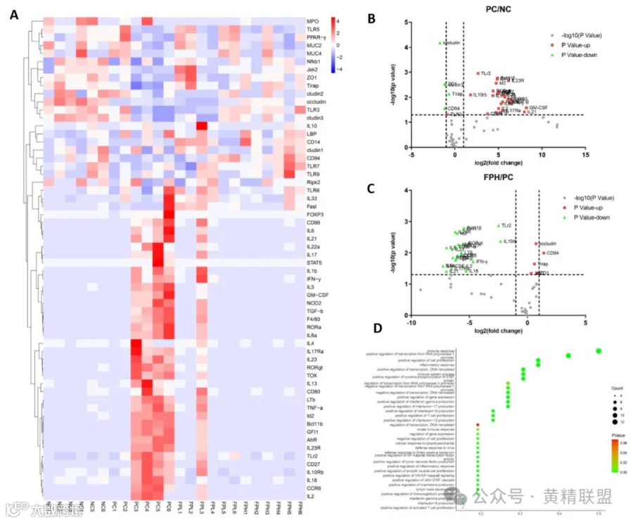 采用RT-qPCR评估NC、PC和FPH组中结肠免疫应答相关基因的表达,组间差异表达基因(Differentially expressed genes, DEGs)如图6所示。相较于NC组,PC组编码TNF-α、IFN-γ、IL-2、IL-18和其他促炎细胞因子的基因显著上调(图6.B)。相较于PC组,FPH组则下调了这些基因的表达(图6.C)。对DEGs进行基因本体(Gene ontology, GO)分析,如图6.D所示,发现与免疫反应、炎症反应、免疫系统过程和IL-17合成的正调控相关的途径丰富。