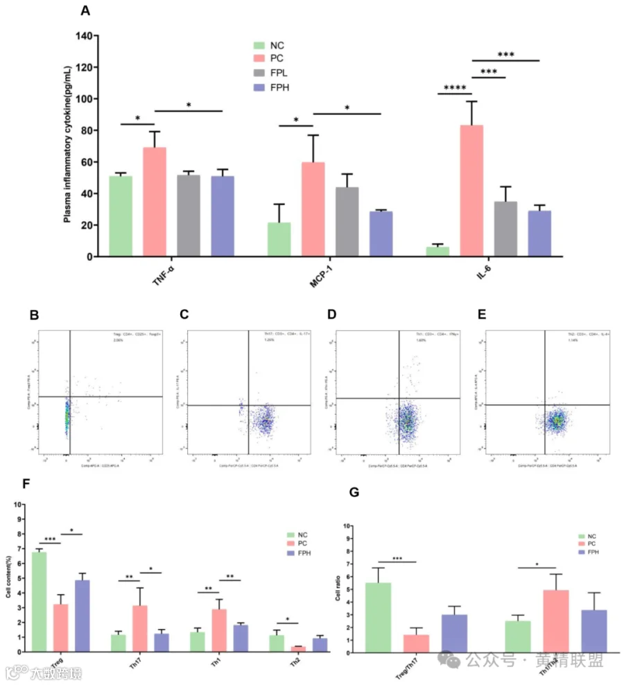 采用流式细胞术检测外周血中Treg、Th17、Th1和Th2细胞的染色情况,分析FP补充对小鼠全身免疫应答的调节作用。如图4.B-G所示,PC组样品中Th1和Th17细胞的比例明显高于NC组样品,FPH组Th1和Th17细胞的比例明显低于PC组。相反,PC组Th2和Treg细胞的比例明显低于NC组,FPH组Th2和Treg细胞的比例则是高于PC组。与NC组相比,PC组的Treg/Th17显著降低,Th1/Th2显著升高,这些比率在FPH组中有轻微恢复。这些结果表明,补充FP可能通过恢复全身免疫反应的稳态来减少炎症。