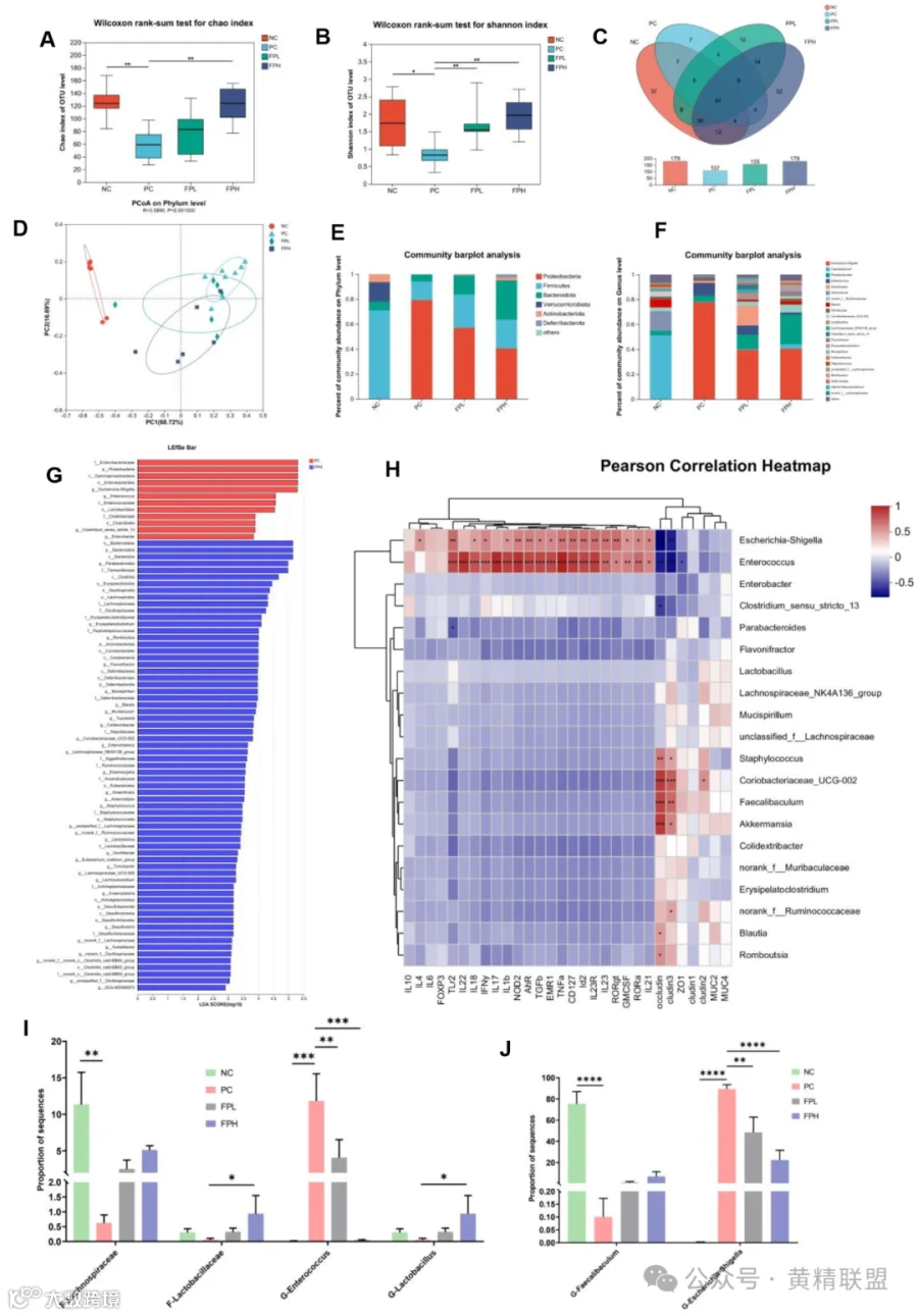 图8.I~J的结果显示PC组检测到高水平的大肠杆菌-志贺氏菌和肠球菌,在FPH组中这些微生物的丰度显著降低。FPH组中乳杆菌科(Lactobacillaceae)和乳杆菌属(Lactobacillus)极显著富集。