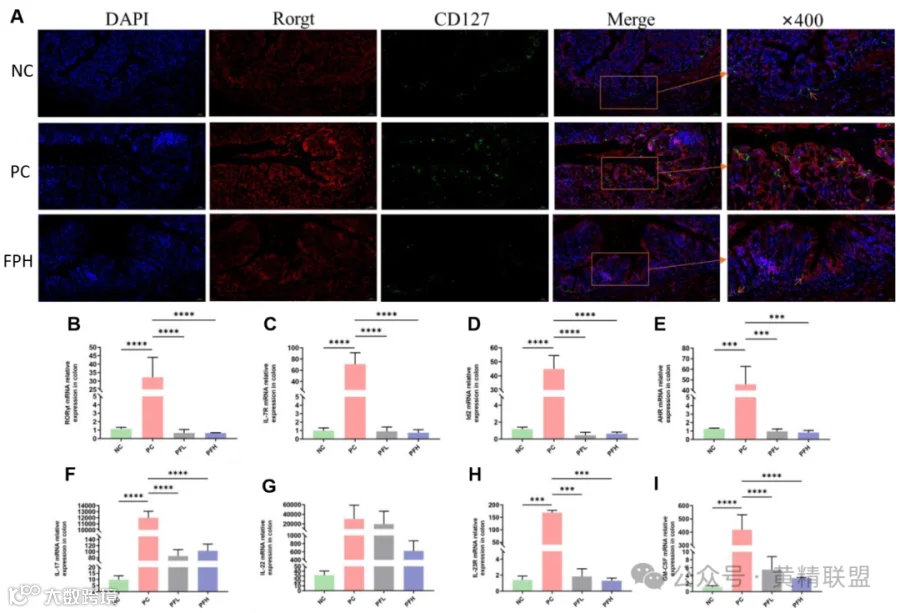 3型天然淋巴细胞(Group 3 innate lymphoid cell, ILC3)主要存在于肠黏膜组织中,在维持黏膜稳态和调节炎症反应中起着至关重要的作用。如图7.A,免疫荧光显示NC组的ILC3主要位于隐斑区,PC组中ILC3数量增加,且迁移到肠绒毛表面。相较于PC组,FPH组ILC3数量明显减少。图7.B~I显示,与NC组相比,PC组结肠中编码各种转录因子和细胞因子的基因显著上调,如IL-17、IL-17R、RORγt、AHR、Id2、GM-CSF、IL-22和IL-23。除IL-22编码基因外,FP预处理组中这些基因的表达明显低于PC组。这些结果表明,补充FP可能抑制ILC3的过度激活和迁移。