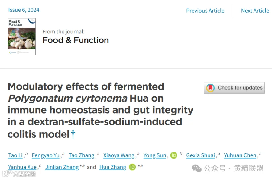 在此背景下,江西中医药大学药学院、南昌大学食品科学与技术国家重点实验室和建昌帮药业有限公司在《Food & Function》(JCR 1区,IF=6.1)发表了“Modulatory effect of the fermented Polygonatum cyrtonema Hua on the immune homeostasis and gut integrity in a dextran-sulfate-sodium-induced colitis model”的研究论文,旨在探讨发酵多花黄精(fermented Polygonatum cyrtonema Hua, FP)通过改善肠道黏膜免疫平衡、维持肠道屏障完整性、调节肠道菌群,改善葡聚糖硫酸钠诱导的肠道炎症,从而探索发酵多花黄精促进肠道健康的潜力。