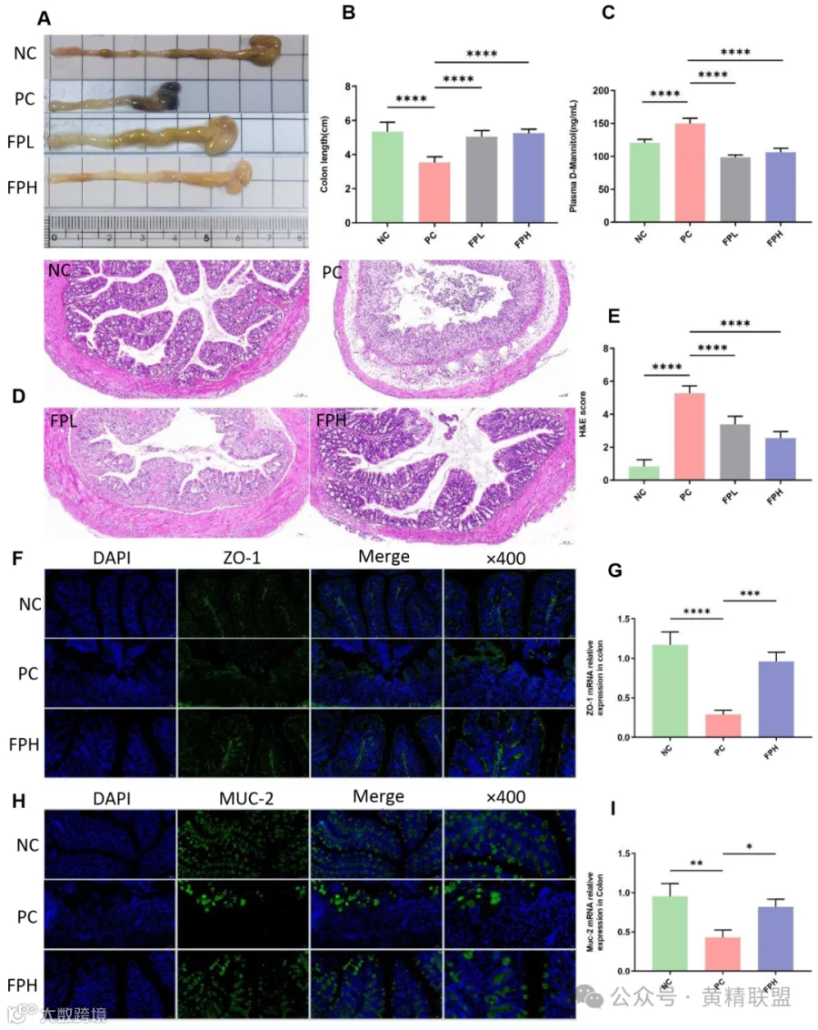 采用免疫荧光染色和RT-qPCR分析各组紧密连接蛋白(TJs)的分布和表达情况,包括粘蛋白-2(MUC-2)和闭锁小带蛋白-1(zonula occludens protein 1, ZO-1)。图5.F和H显示,PC组表现出MUC-2和ZO-1的丢失,图5.G显示PC组的MUC-2和ZO-1的表达相较于NC组明显下调,表明结肠炎损伤明显。然而在FPH组中,这些基因的水平得到了恢复,MUC-2和ZO-1丢失减少。这些结果表明,FP通过影响编码关键肠道TJs的基因表达,减轻了DSS诱导的结肠组织损伤。