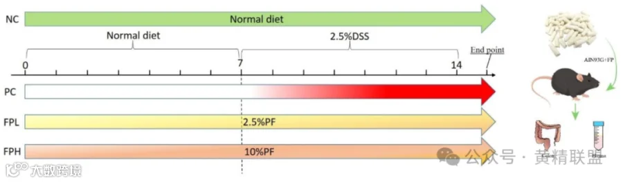 研究选用C57BL/6j雌性健康小鼠,所有小鼠随机分为4组:阴性对照组(NC),DSS处理组(阳性对照组),低剂量FP及DSS处理治疗组(FPL),高剂量FP及DSS处理治疗组(FPH),如图1所示。研究采用植物乳杆菌P9发酵的富含皂苷的黄精。