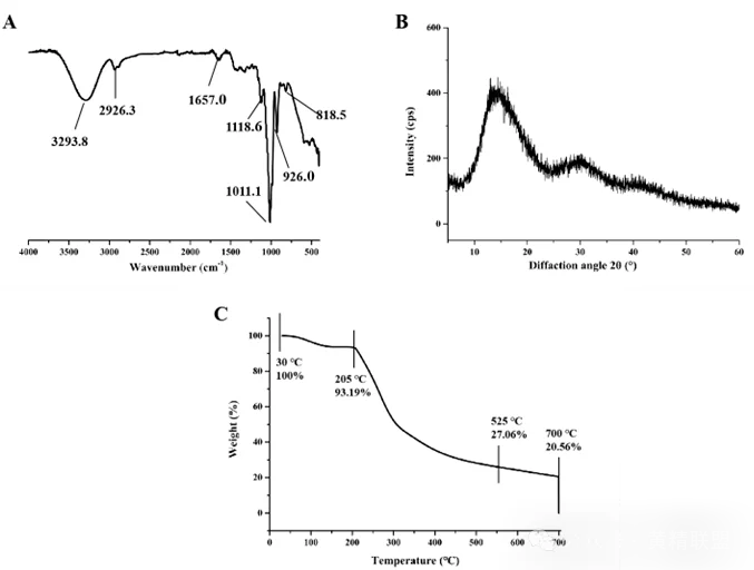 图1 PCP-80%的FT-IR光谱(A),XRD谱图(B)和TGA图(C)。