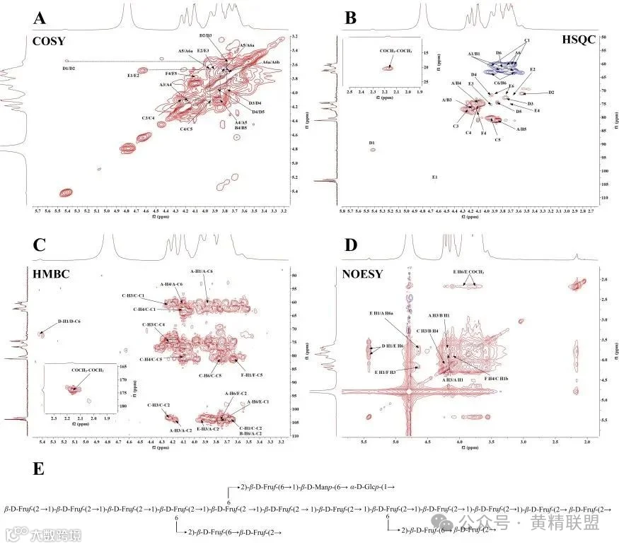 进一步采用核磁共振波谱分析,结果表明 PCP-80%主链可能由→1)-β-D-Fruf-(2→组成,支链以→6)-β-D-Fruf-(2→为主,包含一些→6)-β-D-Manp-(1→和α-D-Glcp-1末端残基(图2)。