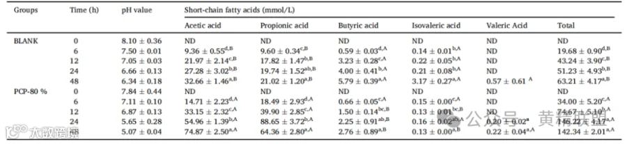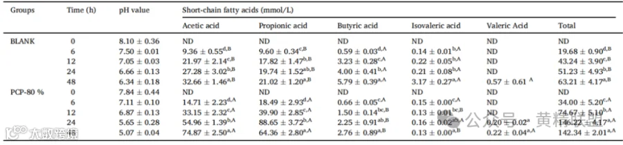 等量的新鲜粪便并与无菌磷酸盐缓冲液在厌氧条件下以1:10的比例混合,并通过无菌纱布过滤。随后,加入0.15g的PCP-80%混合在11mL的基础培养基和9mL的粪便中,37℃下孵育。通过高效液相色谱仪对pH值和短链脂肪酸进行测定,发现PCP-80%的添加能够降低肠道环境pH,促进乙酸、丙酸和正丁酸等短链脂肪酸的产生(表2)。